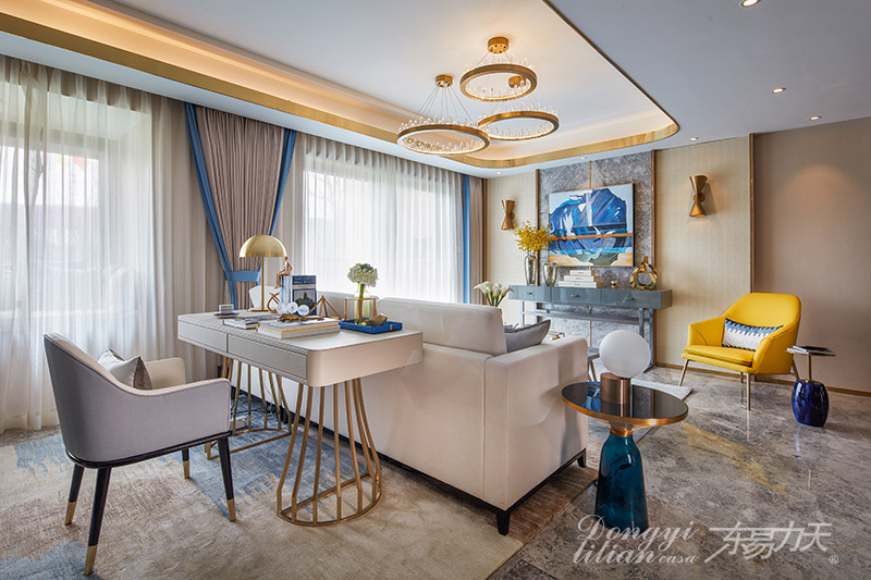 整個客廳空間非常大,設計師根據客戶需求,取中軸線一分為二,將開放式空間設計成客廳、書房兩個空間。鄭州裝飾公司|現代輕奢,要的就是這樣的精致范...